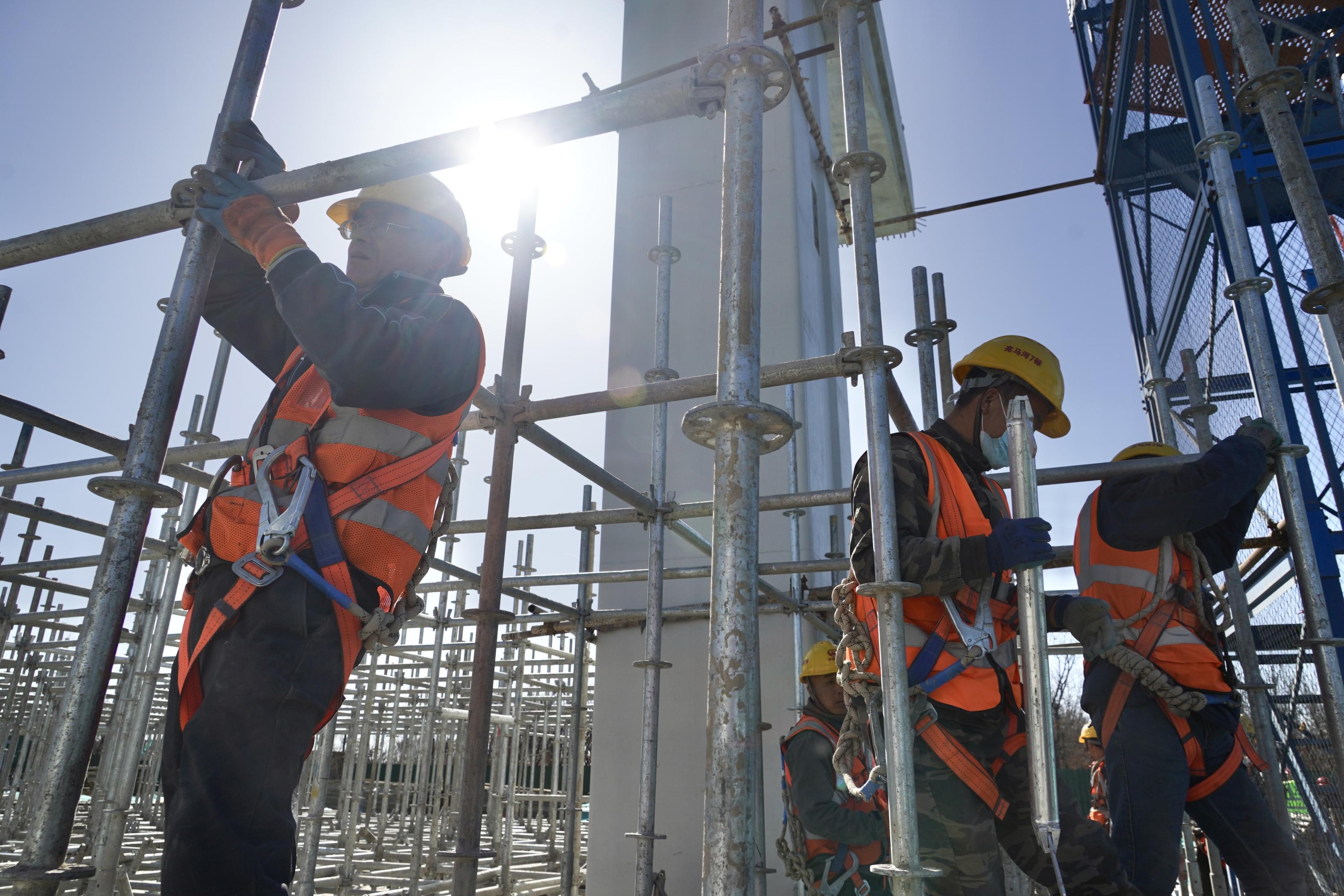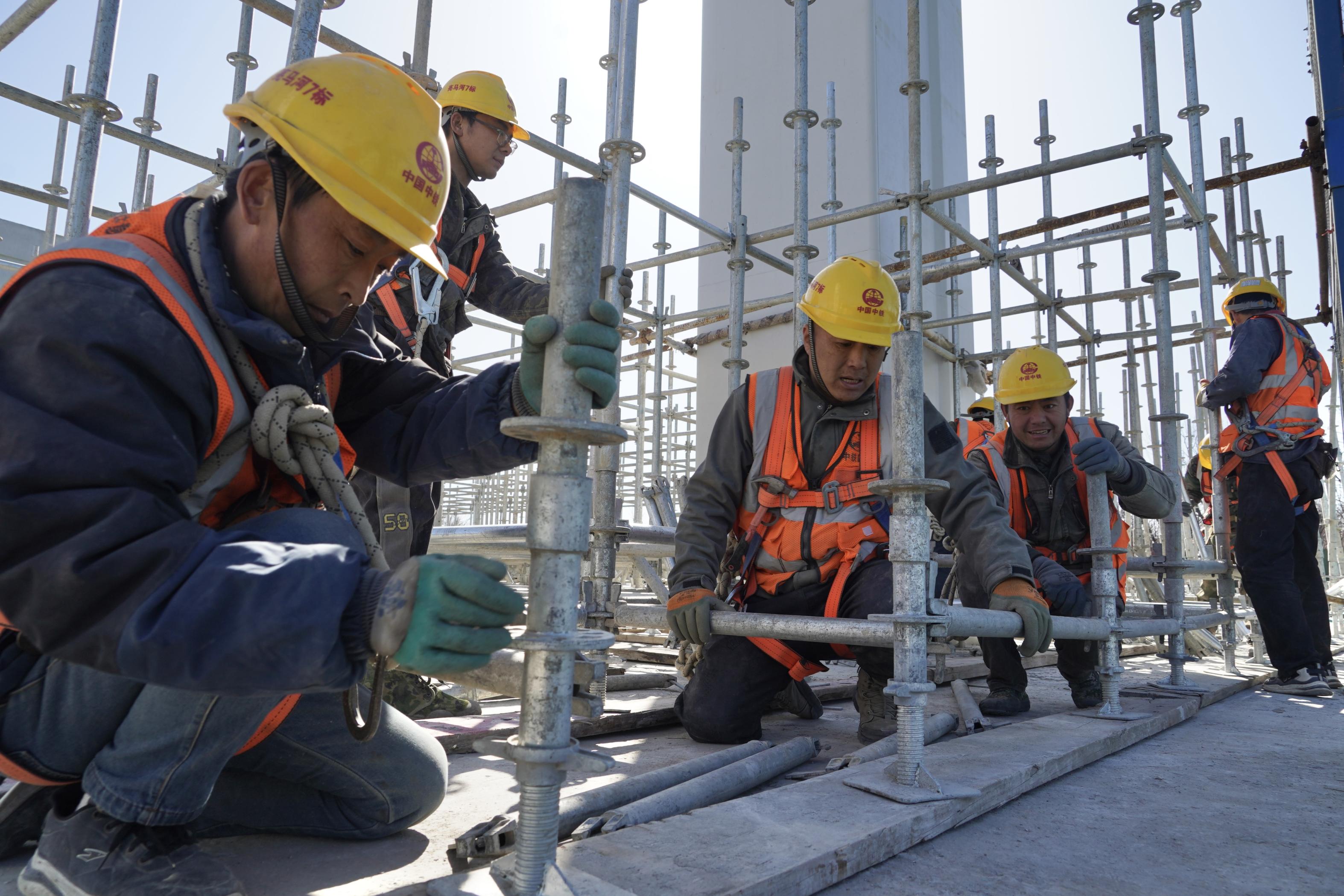 “1、2、抬!”今天上午,记者来到首都机场二高速西侧的亮马河北路施工现场、工人们正在将钢管运送到位,做好搭设脚手架的准备工作。“这一段高架桥采用现浇梁,工人们先要在两个墩柱之间搭好16米高的脚手架,然后在上方搭起模板,工人会在上方绑扎钢筋,最后浇筑成梁。”中铁四局亮马河北路7标项目经理凌萌茁告诉记者。