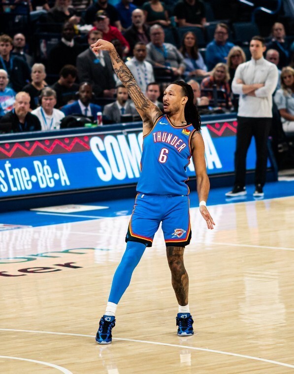 第二节米切尔一人连拿6分,雷霆打出了一波11-0的攻击波,5分03秒杰林-威廉姆斯三分命中,雷霆56-46取得10分优势。掘金在后半段回敬一波10-0,将分差追到只有2分。半场结束前乔三分命中,雷霆66-60领先6分结束第二节。