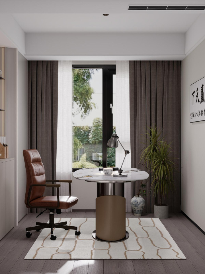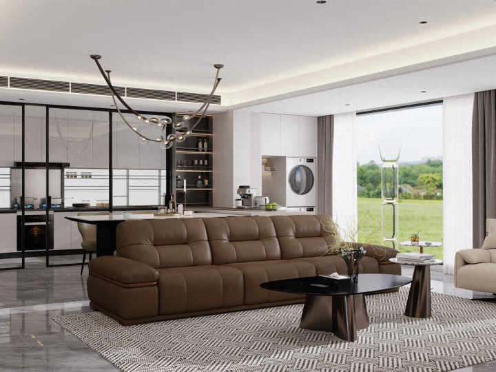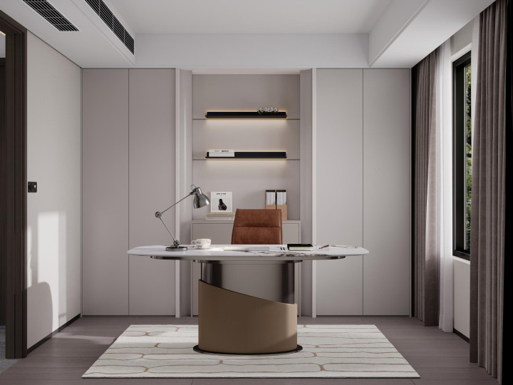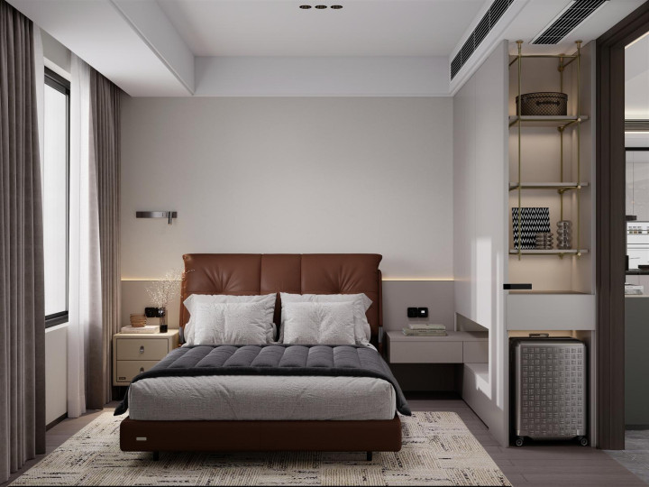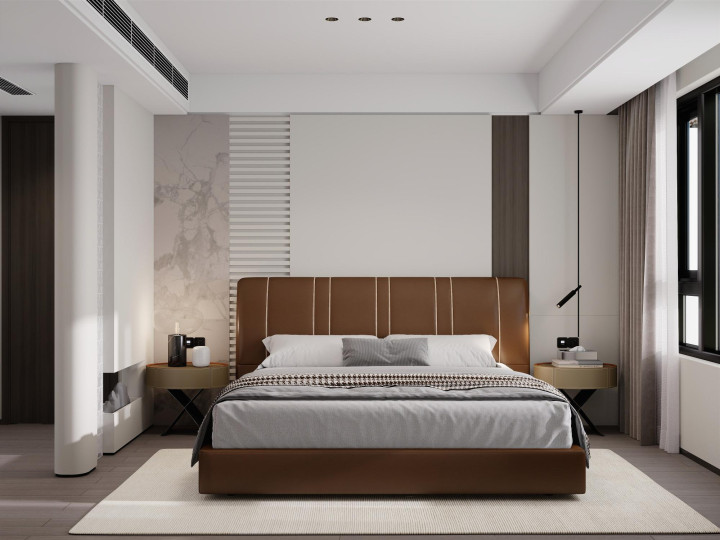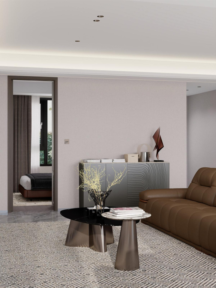 家具选择线条简洁、质感高级的款式。沙发选浅色系直排款,搭配圆形大理石茶几;餐厅用极简长桌+皮质餐椅,利落大气;卧室放弃复杂床头背景,选用低矮软包床+简约床头柜。所有家具摒弃雕花与复杂造型,以舒适、实用、耐看为核心,与整体风格高度统一。