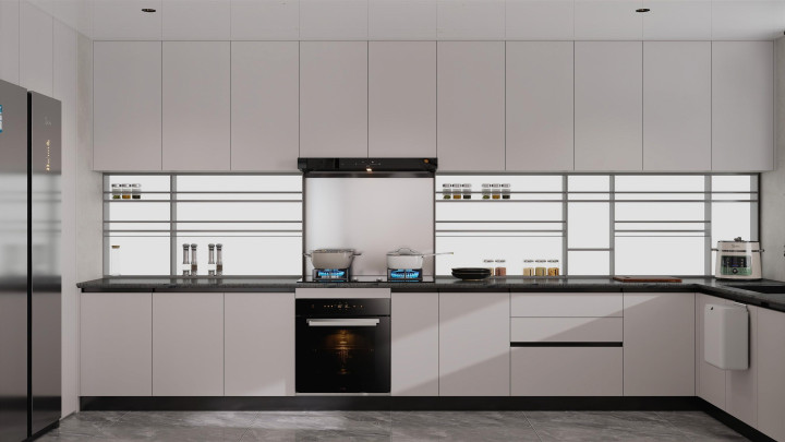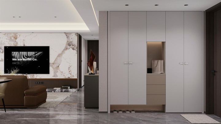 定制部分重点突出收纳与极简一体。玄关做顶天立地鞋柜,隐藏式拉手设计;客厅打造悬浮电视柜与整面收纳柜,减少杂物外露;厨房选用极简肤感柜门,无把手设计更显整洁。所有定制家具都与墙面齐平,弱化柜体存在感,让空间更整洁利落。