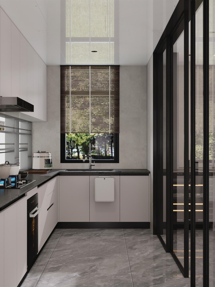 色彩以低饱和度简约色系为主,墙面选用奶白、浅灰等哑光材质,地面通铺浅灰色柔光瓷砖,奠定干净柔和的基调。局部用深灰、原木色做层次点缀,搭配少量金属线条提升精致感,不做繁杂跳色,既时尚耐看,又能长期保持高级感,避免视觉杂乱。
